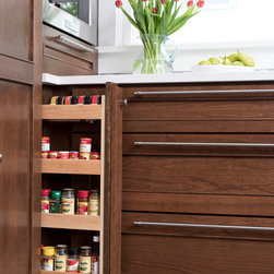 The Dura Supreme stained Cherry Hazelnut finish on a wide modified shaker door and drawer front creates a transitional feel when paired with the other muted selections that really let the cabinetry shine!