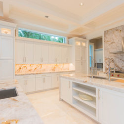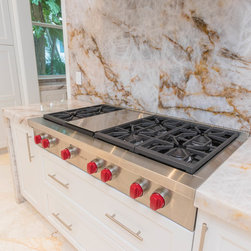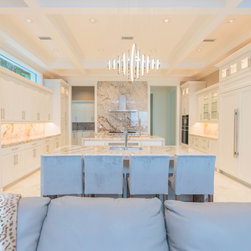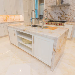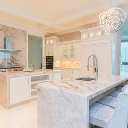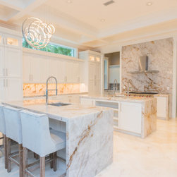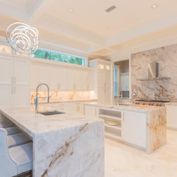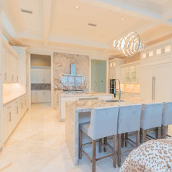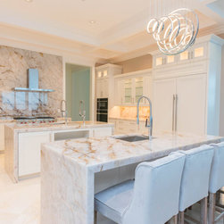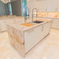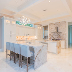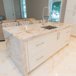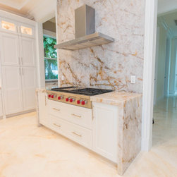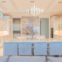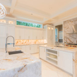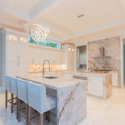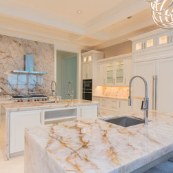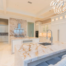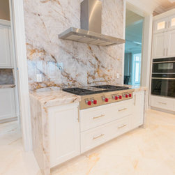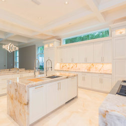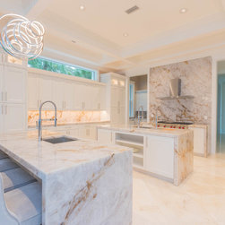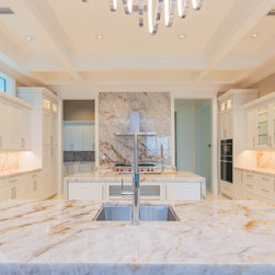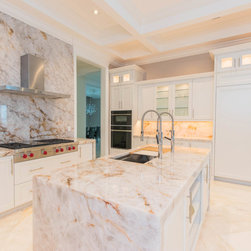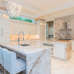The grand space features a white flat panel door style with quartzite countertops, and mitered waterfall edges on the island. A large stone wall behind the cook top, provides a breathtaking focal point, adding to opulence of the room.