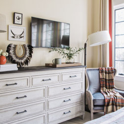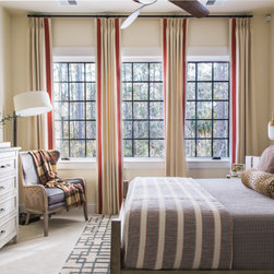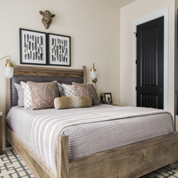 This welcoming guest bedroom features an interesting mix of patterns and prints and an inviting upholstered panel smart bed for a restful night’s sleep. Three tall windows with black painted grids offer contrast for the neutral walls and bring lots of natural light into this multi-functional guest bedroom, with space for reading, relaxing and enjoying a good night’s sleep.
