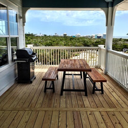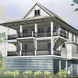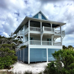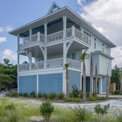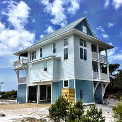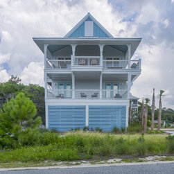 With elevated living this home offers panoramic views from all rooms of the home. Parking under the home you enter the foyer with storage for your beach toys and an option to take the stairs or elevator to your floor of choice. The first floor is for sleeping. A master suite with private bath has access to the rear covered porch. A guest suite also has a private bath and direct access to the porch. Two additional bedrooms share a bath and all have use of the laundry facilities. The upper floor boast an open living, kitchen, and dining area which open to a large wrap around covered porch. Vaulted ceilings and additional balconies are added features that enhance this homes charm.