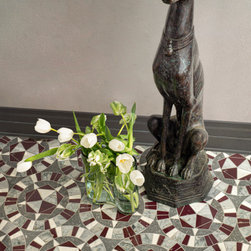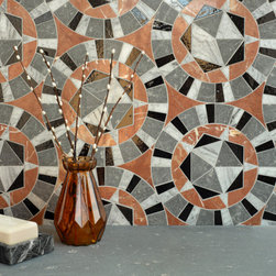 Giacomo, a waterjet cut mosaic, shown in polished Rojo Alicante, Thunderhead, Dahlia, and honed Basalto Orvieto, is part of the San Marco collection by New Ravenna.