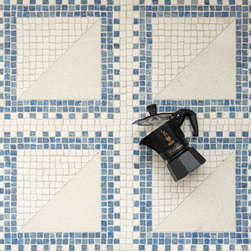 Pietro, a hand-chopped and waterjet mosaic, shown in hand-chopped tumbled Ivory Cream, Blue Macauba, and polished Ivory Cream, is part of the San Marco collection for New Ravenna.