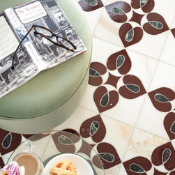 Giacomo, a waterjet cut mosaic, shown in honed Basalto Orvieto, polished Bianco Antico, Snapdragon, and Oyster, is part of the San Marco collection by New Ravenna.