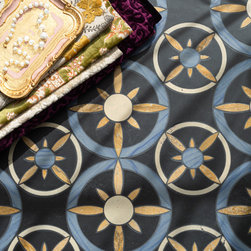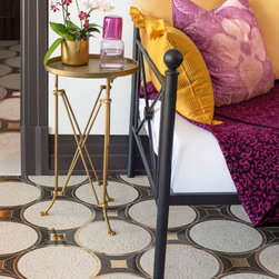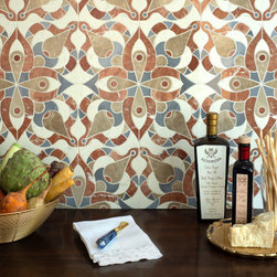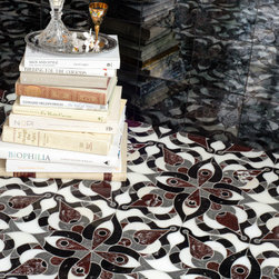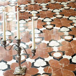 Carlo, a hand-cut and waterjet mosaic, shown in honed Bianco Antico, Orpheus Black, polished Aurum, Blue Macauba, Chinese Purple, Verde Luna, Rojo Alicante, and Chartreuse, is part of the San Marco collection for New Ravenna.