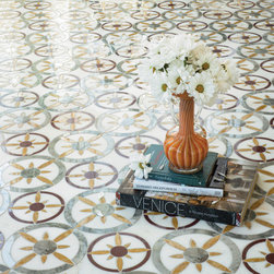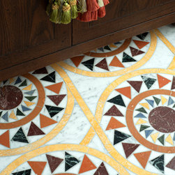 Gaspara, a waterjet cut mosaic, shown in honed Carrara, polished Persian Gold, Blue Macauba, Chartreuse, Maple, Verde Alpi, and Aegean Brown, is part of the San Marco collection by New Ravenna.