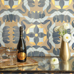 Caterina, a waterjet cut mosaic, shown in honed Lagos Gold, polished Celeste, Aurum, and Blue Macauba, is part of the San Marco collection by New Ravenna.