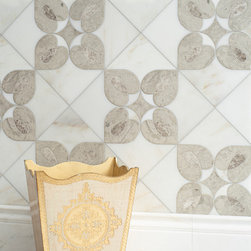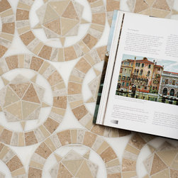 Zilia, a waterjet cut mosaic, shown in honed Calacatta Monet, Palomar, and polished Stratus, is part of the San Marco collection by New Ravenna.
