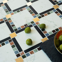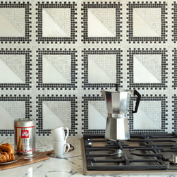 Antonio, a hand-cut and waterjet mosaic, shown in honed Bianco Antico, polished Aurum, and Mangrove, is part of the San Marco collection for New Ravenna.