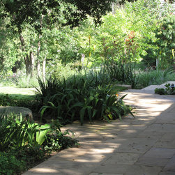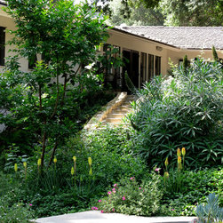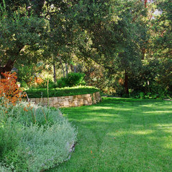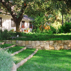 This was a project I am especially proud of. The owners were looking for a whole new redesign of their backyard that included a pool, shady gardens and the need for retaining walls and terraced landscaping. By incorporating a mix of succulents and bright native flowers this backyard sings with color and mixes nicely with the variety of hues in the rock wall planters and steps. I particularly love the grass steps with just a simple rock riser.