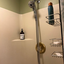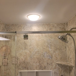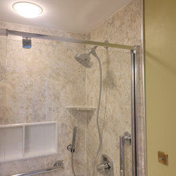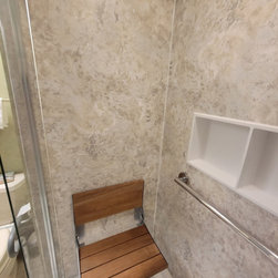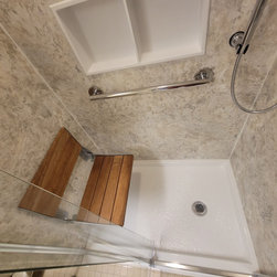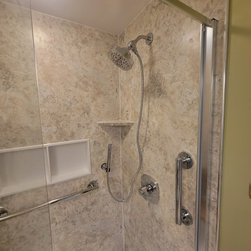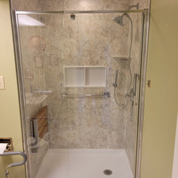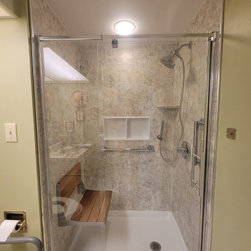 We replaced a stand up shower with a custom walk in shower, complete with wall niches, grab bars, shower seat and glass doors.