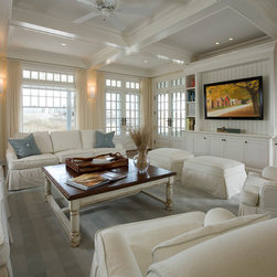 A cozy study provides for secluded retreats from the activities of a full house. A great room with expansive views to the sea dons a coffered ceiling and a fireplace. The great living room opens to a unique screened porch that is enclosed by the open wrap around porch.