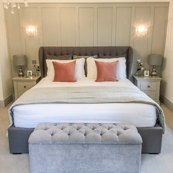 Elegant master bedroom with grey panelled wall