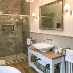 Grey brick tiled master ensuite with Neptune washstand and traditional towel rad