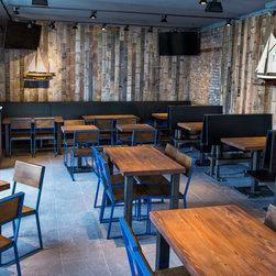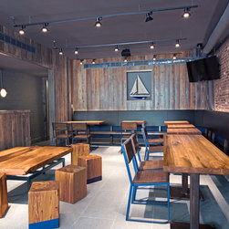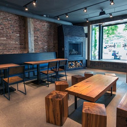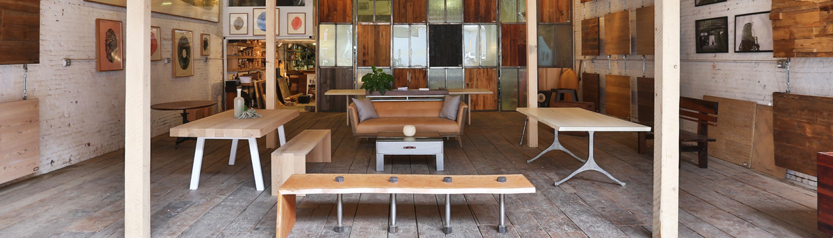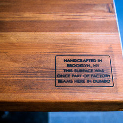 Handcrafted by Mark Jupiter from locally-salvaged factory beams (including Heart Pine found in an old coffee warehouse, shaving soap factory and automotive garage) DUMBO's new Shake Shack is outfitted with some of the most unique pieces out there.