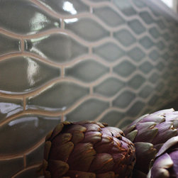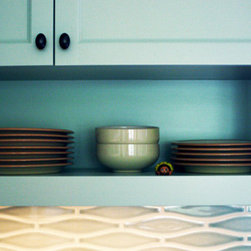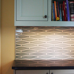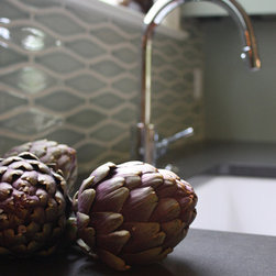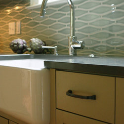 Alice Design and Domestic Arts, the kitchen is a fun interplay of materials and colors, punctuated by its wave-form back splash tile. Reclaimed wood,