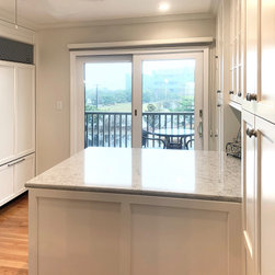 A view into the kitchen. Recessed panel white kitchen cabinetry with panel ready sub-zero refrigerator.