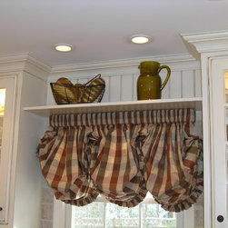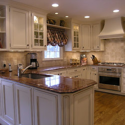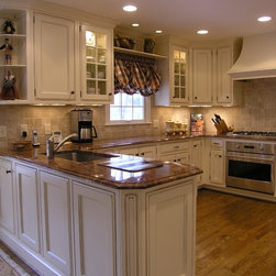 Features: Custom Wood Hood; Custom Finish and Door Style; Valance with Shelf and Beadboard; Wood Mullion and FSA Clear Glass Doors; Open Shelving; Custom Clipped Corners on Peninsula