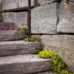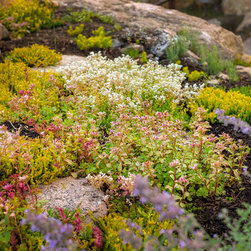 Sedum varieties are used to soften the rocks and slab steps, and are used where highly visible, inviting passers-by to stop and take in the visual and tactile beauty and touch of these plants.
