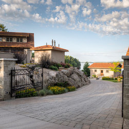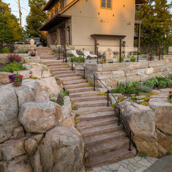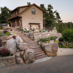 The landscape development highlights the existing granite outcroppings and cliffs, while transitioning into the built landscape features through boldly interjecting Spanish style stucco walls and cut granite slabs and boulders. The following is an outline of its many features: