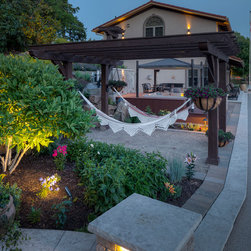 Landscape lighting provides an intimate feel after dark, as guests move to the adjacent dining area and outdoor wood fireplace. The furnishings are consistent with the Spanish-influence décor.