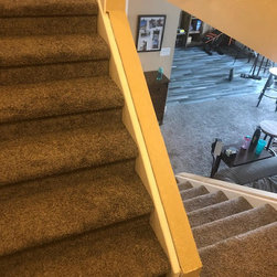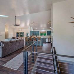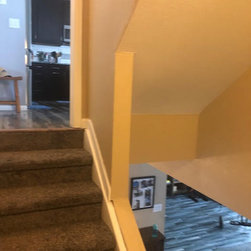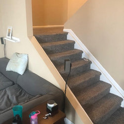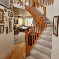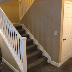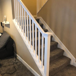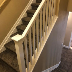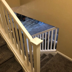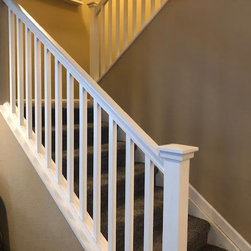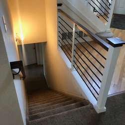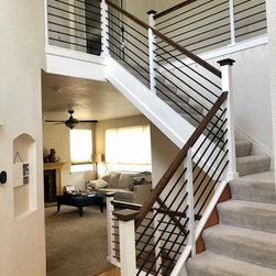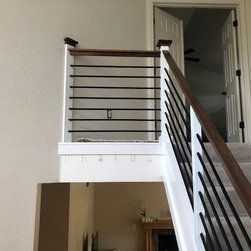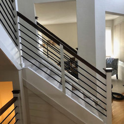 Black iron horizontal railing on white newel posts with hickory stained railing and newel caps.