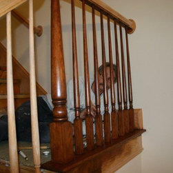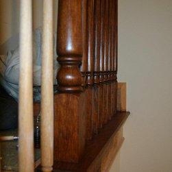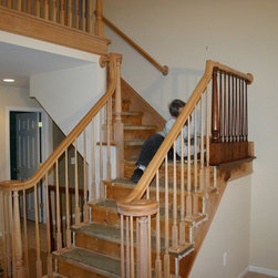 Refinishing of an existing out dated stair railing with a white washed finish updating the old look with a new warm cherry finish. We're located in Canton Michigan and we can do this for you. We are Accent Remodeling.