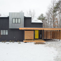 This home's new exterior features a car port, a fresh coat of black paint, a section of corrugated metal, and a cheery yellow front door.