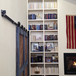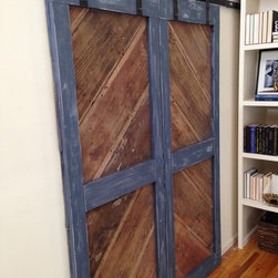 Sliding barn-style doors made from reclaimed wood lead from the living room into the master bedroom.
