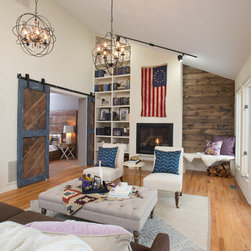 This open living room features a propane fire place, an old American flag, ample seating, and sliding rustic barn doors that lead to the master bedroom.