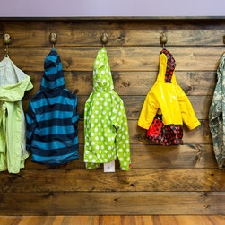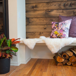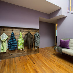The family's new entryway includes a bench for pulling shoes on or off and a area covered in reclaimed wood with plenty of hooks for jackets and scarves.