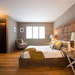 This tranquil master features reclaimed wood sliding doors and a rustic headboard anchored by cozy bedding and two table lamps.