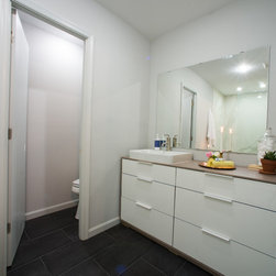 The bathroom has a private section for the toilet and a new sink area complete with plenty of drawer space. The bright palette makes the room feel even larger.