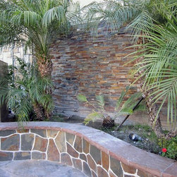 The "California Gold" color of our beautiful new stone ledgers used to build a beautiful backdrop wall and waterfall. Now available at our three DFW Seconds & Surplus locations as well as our online store.