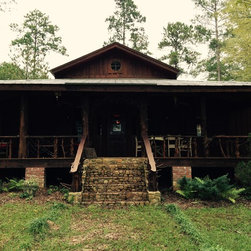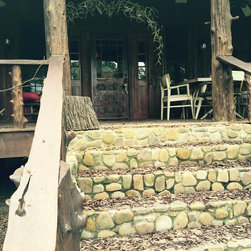 Front porch - front entrance to hunting lodge. Cedar tree posts,cedar slab hand rails,cedar branch balusters, and river stone steps. Designed and built by Bobby Huellemeier, elemental thought