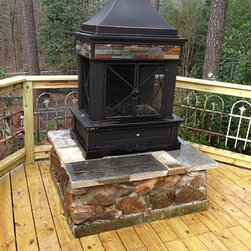Outside deck, fireplace with stone pedestal, and railing incorporating old wrought iron fence. Designed and crafted by Bobby Huellemeier. elemental thought