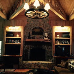 Great room in rustic hunting lodge. . Star vaulted ceiling with handmade truss system. Wagon wheel converted to chandelier.All trusses hand built designed and crafted by Bobby Huellemeier. elemental thought