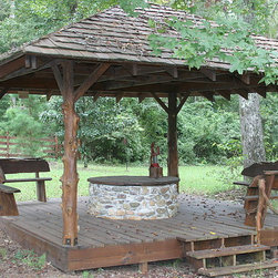 Covered spring/well pavilion. Cedar posts and benches. Cedar shake roof and cedar hand rail. Designed and crafted by Bobby Huellemeier. elemental thought