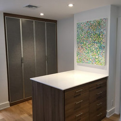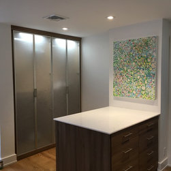 Master Suite: open plan closet design to expand bedroom size and provide attractive storage. Thin metal door frames with fabric/acrylic insert, back lighting, thassos stone top for the island.