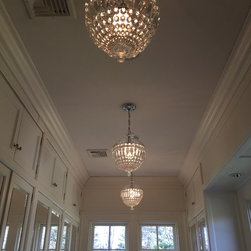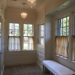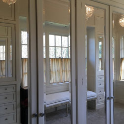 Custom built dressing room closets with bevel glass doors and crystal chandliers.. Great storage for a traditional dressing room.