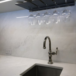 Beautiful marble backsplash and counter top. Organized storage of wine glasses and coffee mugs.