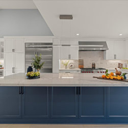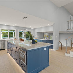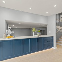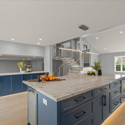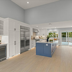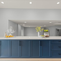 Thoughtful Details integrated the living spaces seamlessly with the redesigned kitchen. Creamy swiss coffee perimeter cabinets sit sidelines allowing the massive deep blue island to take center stage. The deep blue carries into the bank of cabinets separating the sitting room and offering plenty of storage and countertops space. The kitchen’s large scale allowed space for a 48’’ gas range and stylish wine bar. The dining area, now more accessible and inviting, promises to be the backdrop for countless memorable gatherings.