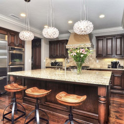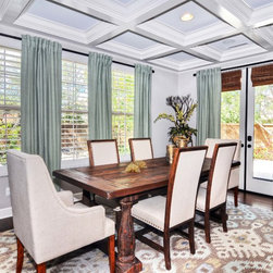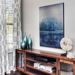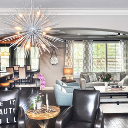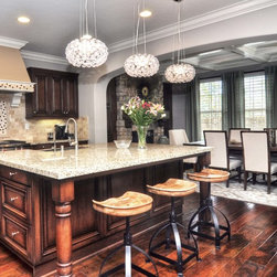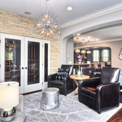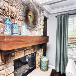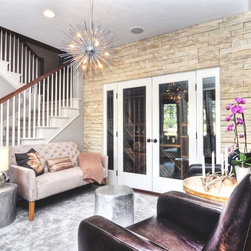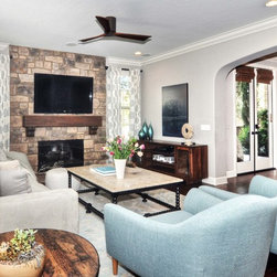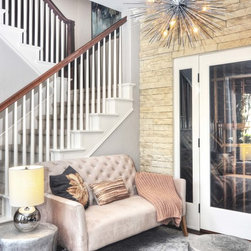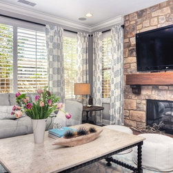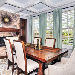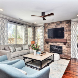 Casual elegance with rustic elements are features of this newer home with an open floor plan. This was designed for a young family looking for a stylish yet comfortable and inviting space for family life and get-togethers. The colors and tones were kept soft, light and airy to balance out the heavier rustic wood and stone elements. Traditional architectural features were juxtaposed with contemporary furniture and lighting. Child-friendly and natural materials make the home livable and practical, and contribute to an elegant and leisurely space.