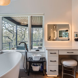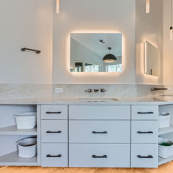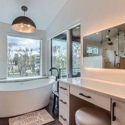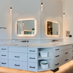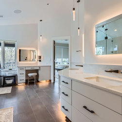A custom double vanity features waterfall-edge quartz countertops, integrated lighting behind the mirrors, and matte black hardware that adds a contemporary edge. Across from the tub, a built-in makeup vanity provides a dedicated station for morning routines, balancing elegance with everyday functionality.