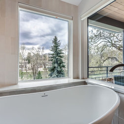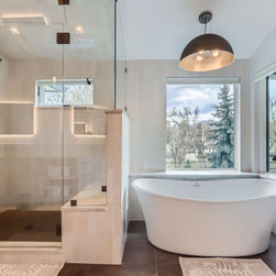 A walk-in shower with floor-to-ceiling tile and frameless glass enclosure anchors the room, complete with a built-in bench, dual showerheads, and softly lit niches for added ambiance. The freestanding soaking tub sits beside expansive corner windows, inviting in natural light and tranquil views—perfect for long, relaxing soaks.