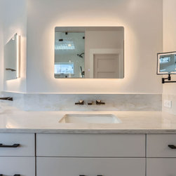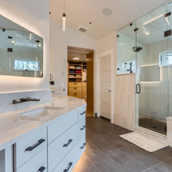 This serene primary bathroom blends sleek modern lines with luxurious spa-like features, creating a calming escape designed for both beauty and function. Thoughtful lighting, refined materials, and architectural simplicity define the space.