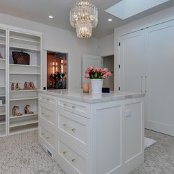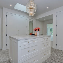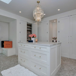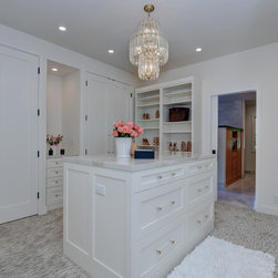 But the allure doesn't end there. Prepare to be captivated by this San Jose master suite's main focal point: a divine closet fit for royalty. With its sophisticated marble-topped island, gleaming brass handles, and jaw-dropping antique chandelier, it serves as a sanctuary within a sanctuary, where simplicity and quiet drama converge in perfect harmony.