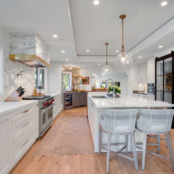 Step into the heart of the home and behold the epitome of sleek sophistication. Crisp white shaker cabinets adorned with opulent brass and wooden accents, a captivating fireplace, nestled within a wooden mantle and stone surround, commanding attention and setting the stage for unforgettable gatherings.