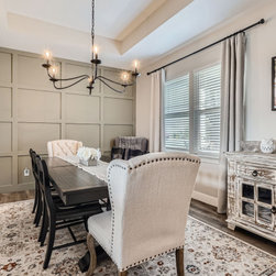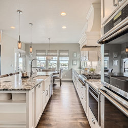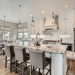 The kitchen is the heart of the home, featuring white cabinetry, a statement range hood, and a spacious granite island that anchors the open-concept layout. Subtle herringbone tile details and sleek pendant lighting add depth and warmth, while the adjoining dining area showcases custom millwork and soft neutral tones for a perfect balance of formality and ease.
