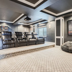 Downstairs, the home transforms into an entertainer’s retreat with a luxurious theater room, complete with tiered seating and custom ceiling accents. The adjoining office space provides a quiet corner for productivity without sacrificing style.