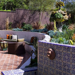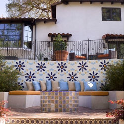 Outdoor built in seating area with a few different mediterranean tile applications.